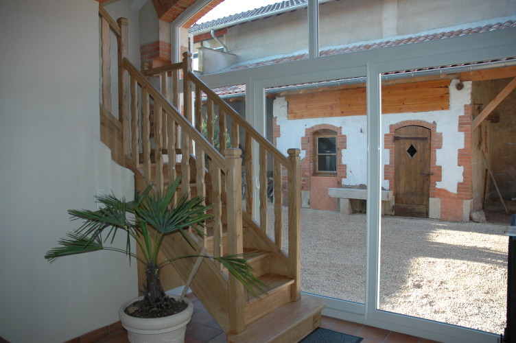 Cour extérieure fermée, avec un salon de jardin, un barbecue, des chaises longues et un coin enfants.